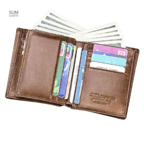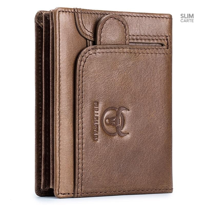 Portefeuille en cuir véritable vintage. Disponible en café, noir et camel, il allie style intemporel et praticité pour vos essentiels quotidiens.