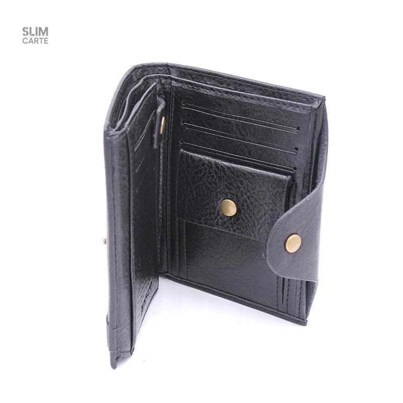 • Compartiments : une pochette à bouton pression, un emplacement pour les billets, une poche zippée pour la monnaie, plusieurs emplacements pour cartes, et un porte-photo interne