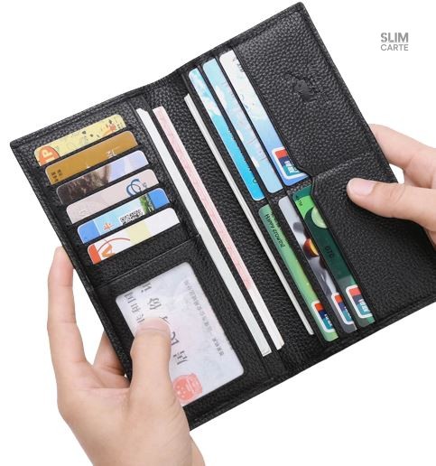 Ce portefeuille fin se compose de plusieurs compartiments astucieusement pensés : il offre deux grands espaces pour vos billets, 12 fentes pour cartes, y compris une pochette transparente pour votre carte d’identité. Une poche zippée permet également de stocker vos pièces de monnaie en toute sécurité. Avec une capacité d’organisation maximale, il répond aux besoins de tous, que ce soit pour des cartes bancaires, des cartes de fidélité ou même des reçus importants.